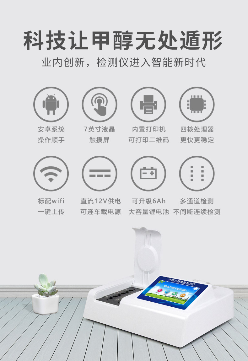 检测项目:可快速定量检测各类酒中的甲醇和乙醇的含量,仪器预留其他项目检测程序和端口,根据日后需求可方便的自主增加检测项目。日后可升级为检测,水产品,肉制品,面制品的综合类型仪器。